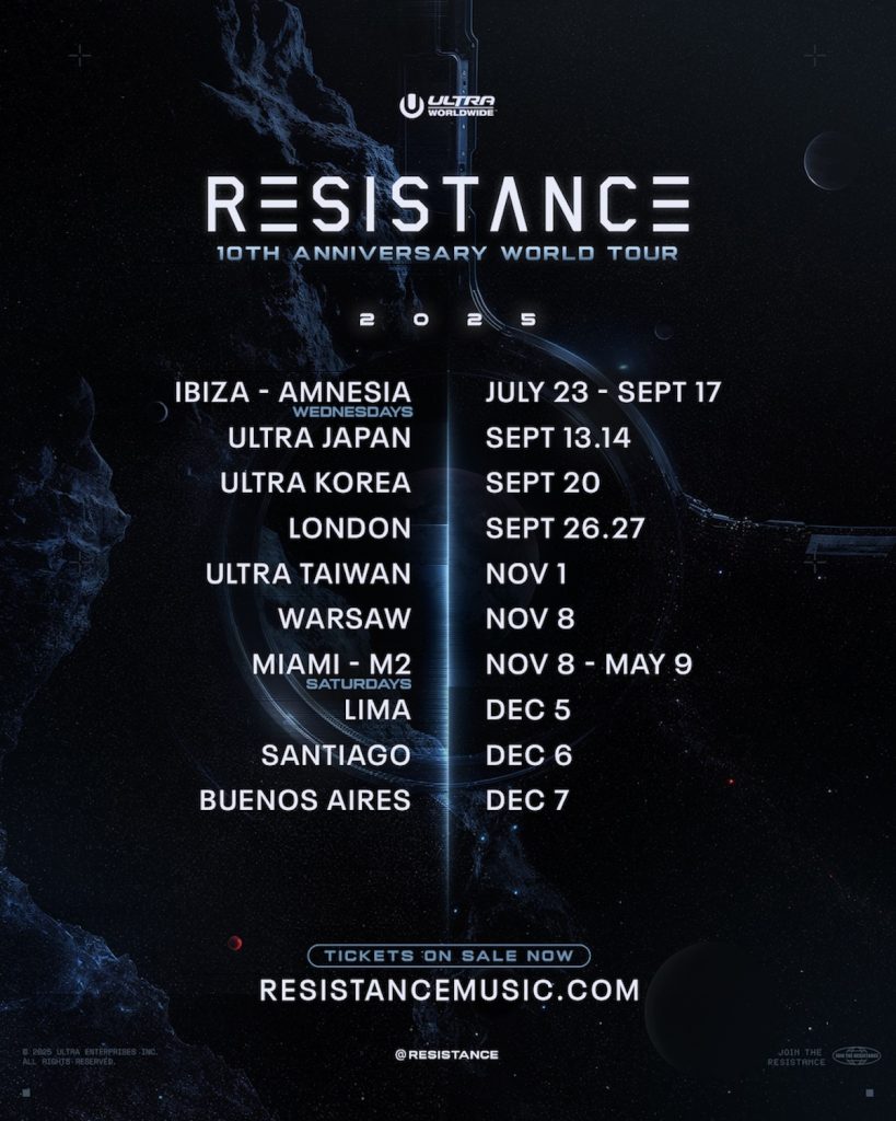 November and December 2025: RESISTANCE – ULTRA Worldwide’s esteemed underground series – celebrates its ten-year milestone with a transcontinental world tour, featuring global club residencies, standalone events, and festival programming.